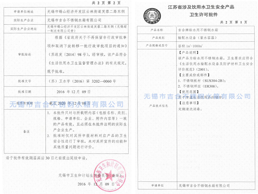 公司各種生產(chǎn)設備齊全,多年來(lái)積累了豐富的水箱設計、制作、安裝經(jīng)驗,水箱經(jīng)江蘇省疾病預防控制中心檢驗合格,并取得江蘇省衛生廳頒發(fā)的涉及飲用水衛生安全產(chǎn)品“衛生許可證件”。